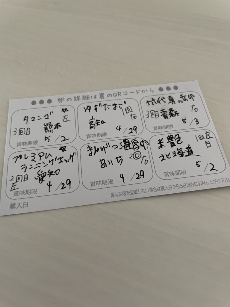 6個パックとカードとペンが置いてるのでそれに選んで卵と名前賞味期限を書いていく🖋